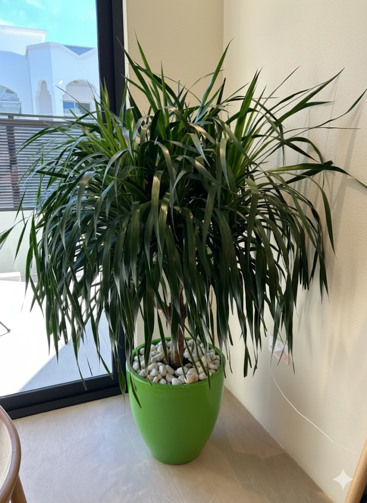 Dracaena Draco (Drago or Dragon Tree) in Rolled Rim Pot (48x37cm) is a majestic outdoor ornamental plant known for its thick, woody trunk and rosette of sword-shaped green leaves.