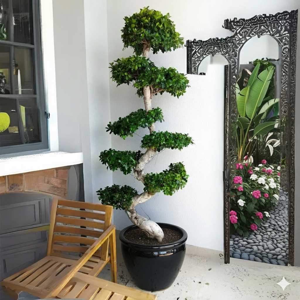 A magnificent, large Ficus ‘S’ Bonsai featuring an impressive sculptural trunk and lush, glossy green foliage. Standing 1.8–2.0 m tall, it serves as a stunning statement piece for spacious interiors, offices, or lobbies.